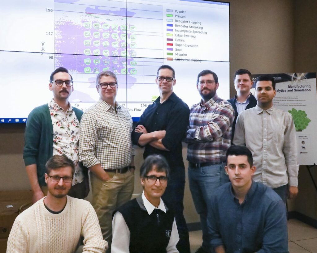 The ECP’s ExaAM team gathers in front of a screen from ExaAM, a simulation toolset for exascale supercomputers that can model entire metal parts being constructed through the 3D printing process. From left, standing: Sam Reeve, Alex Plotkowski, Matt Bement, Stephen DeWitt, Austin Isner, Matt Rolchigo. From left, sitting: Gerry Knapp, Adrian Sabau,Philip Fackler. Photo by Kelley Smith/ORNL.