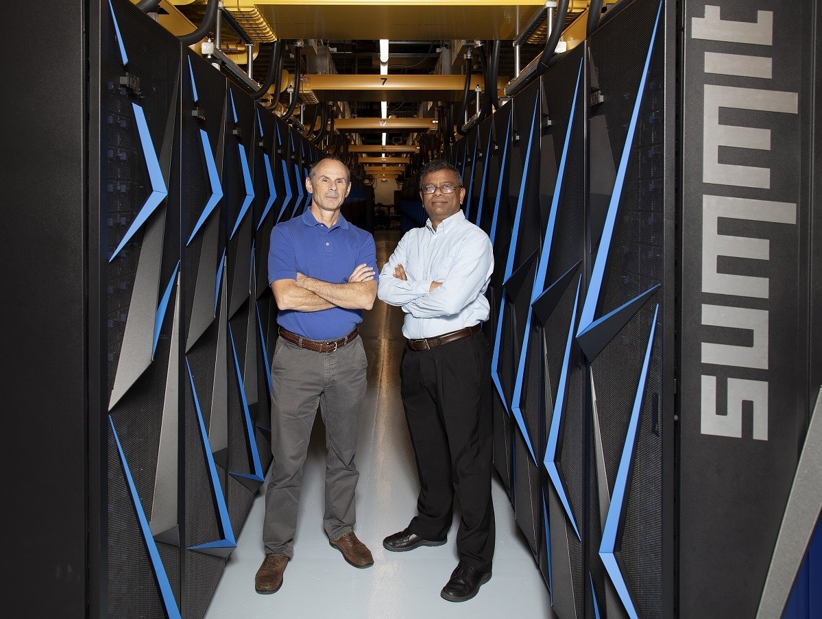 L-R: John Turner and Suresh Babu, pictured here with the Summit supercomputer at ORNL, are part of a multi-laboratory team developing an exascale computing application to simulate additive manufacturing of born-qualified parts for critical systems. Photo courtesy of Oak Ridge National Laboratory, U.S. Dept. of Energy.