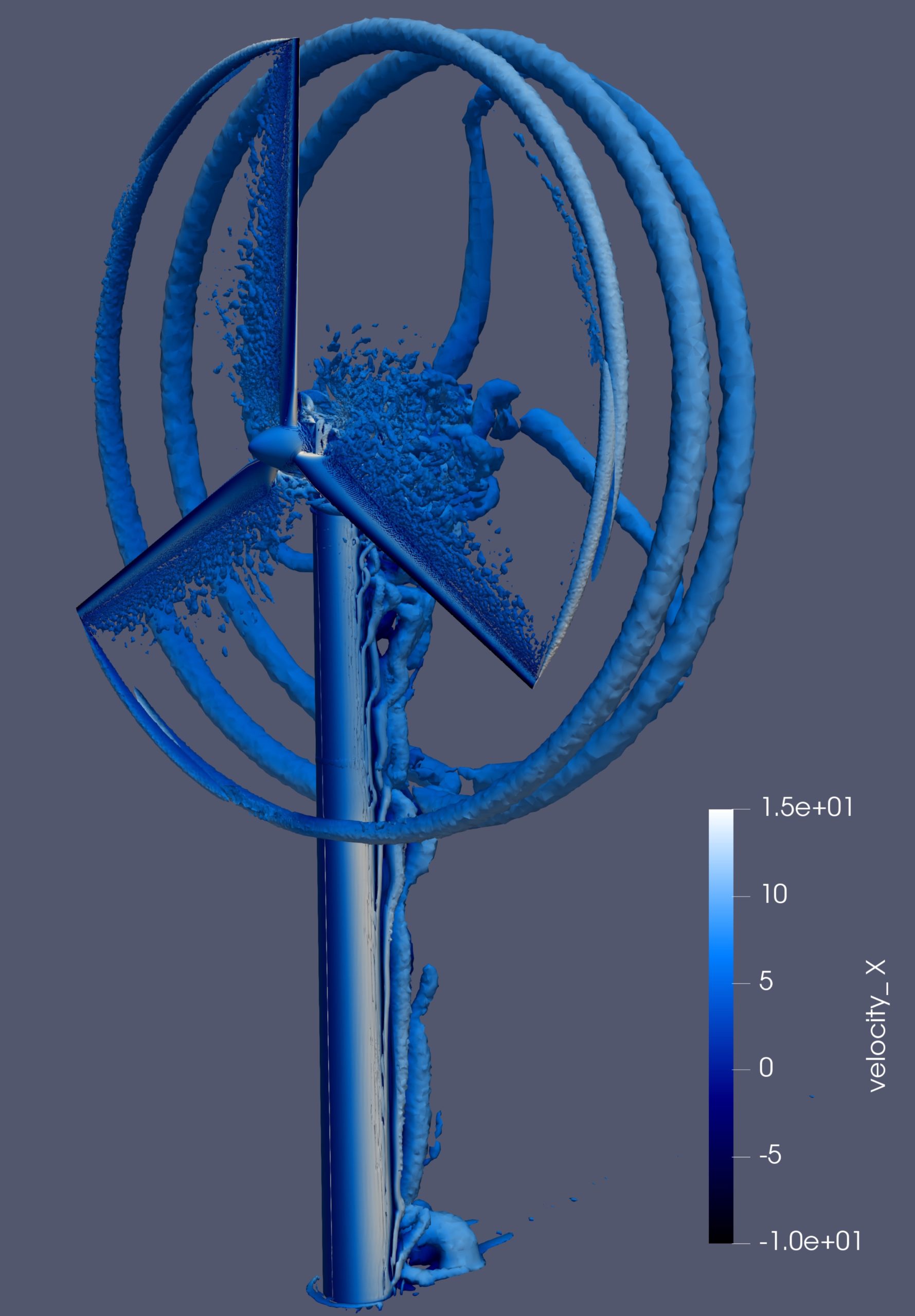 Simulation results from ExaWind Exascale Computing Project and the Nalu computational-fluid-dynamics code for a geometry-resolved turbine. Shown are Q-criterion iso-surfaces colored by the wind-direction-velocity magnitude. (ExaWind Poster, SAND2018-1050D, Exascale Computing Project 2nd Annual Meeting, Knoxville, TN, February 6, 2018)