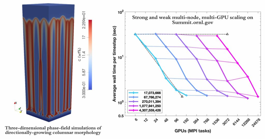 (left) 3D simulation snapshot showing alloy dendrite evolution using the Tusas phase-field approach. (right) Strong and weak multi-node, multi-GPUs scaling on Summit.