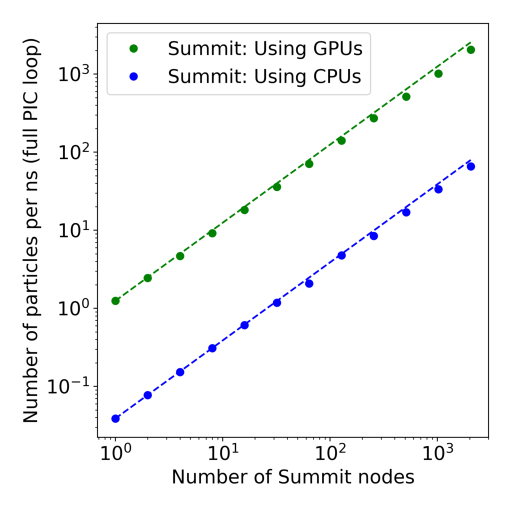 Results of a weak scaling study on a uniform plasma setup on Summit. The x-axis shows the number of Summit nodes, while the y-axis shows the number of particle advances per nanosecond. Both the CPU and GPU versions of the code scale well, and the overall speedup associated with using the accelerators is ∼30.