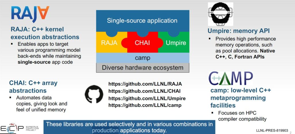 ← → Figure 4: A Suite of libraries provide single-source portability. (Source: An Overview of the RAJA Portability Suite)
