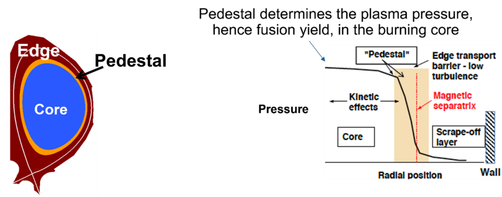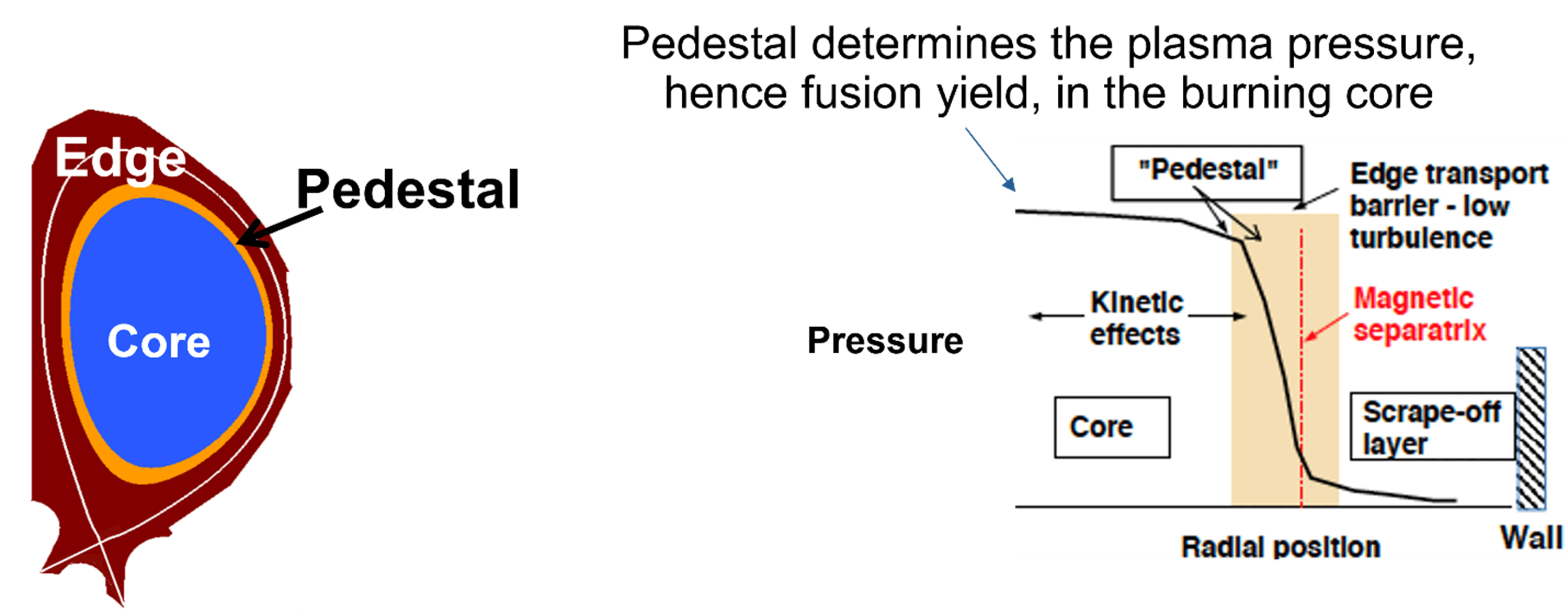 Figure 4. High-fidelity simulation of a whole-device burning plasma (specifically, ITER with full plasma current) operating in “high-mode” (H mode), and prediction of the plasma pressure “pedestal” shape (height and width).